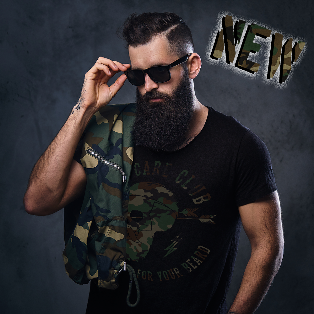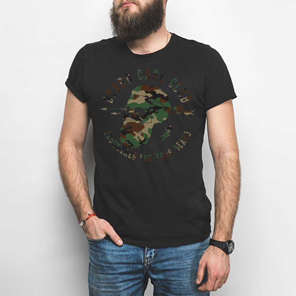 Do you like black shirts? Do you like camo? Do you like guns (gun flag is optional)? Well then, we have the shirt just for you! This is our new Beard Care Club Grooming Company, preshrunk, cotton, Next Level Apparel T-Shirt, and it fits oh so lovely and soft!