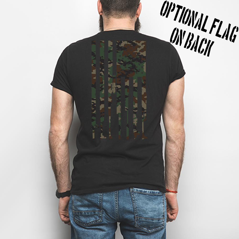 Has an optional flag made of camo guns on the back. If firearms offend you, simply don't add it to the shirt. Easy peasy now we're all skipping through life happy as can be!